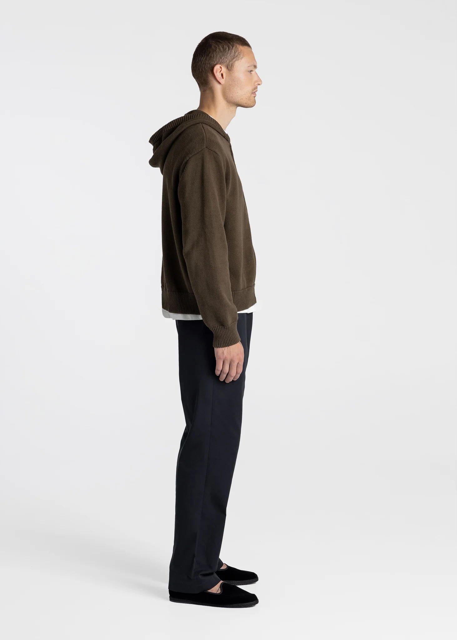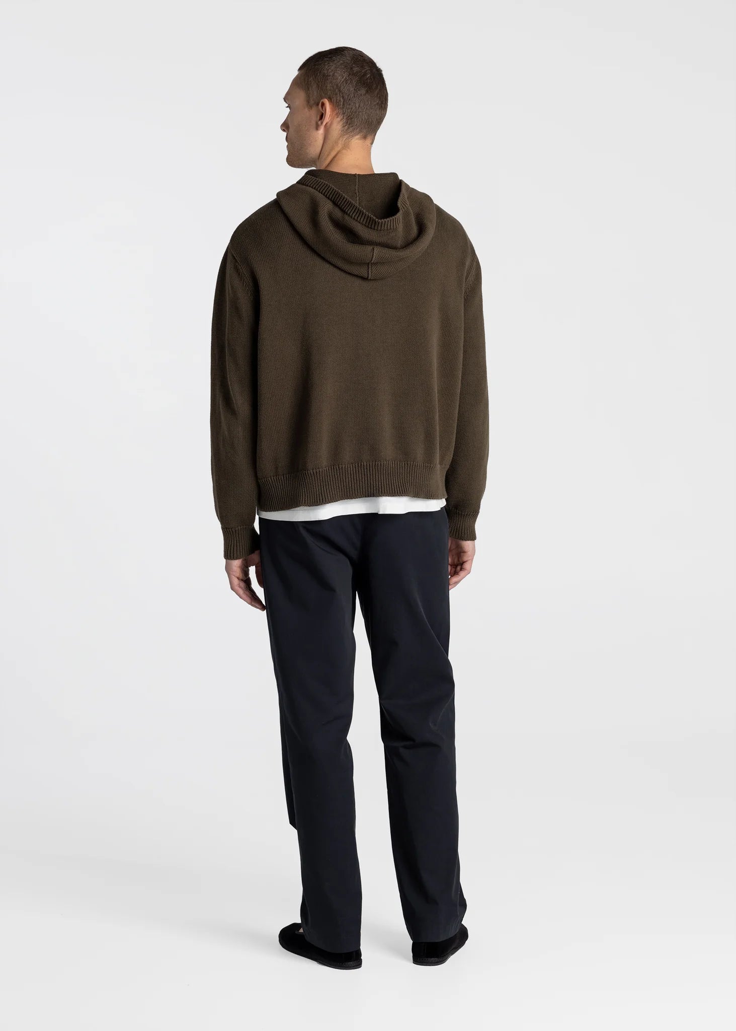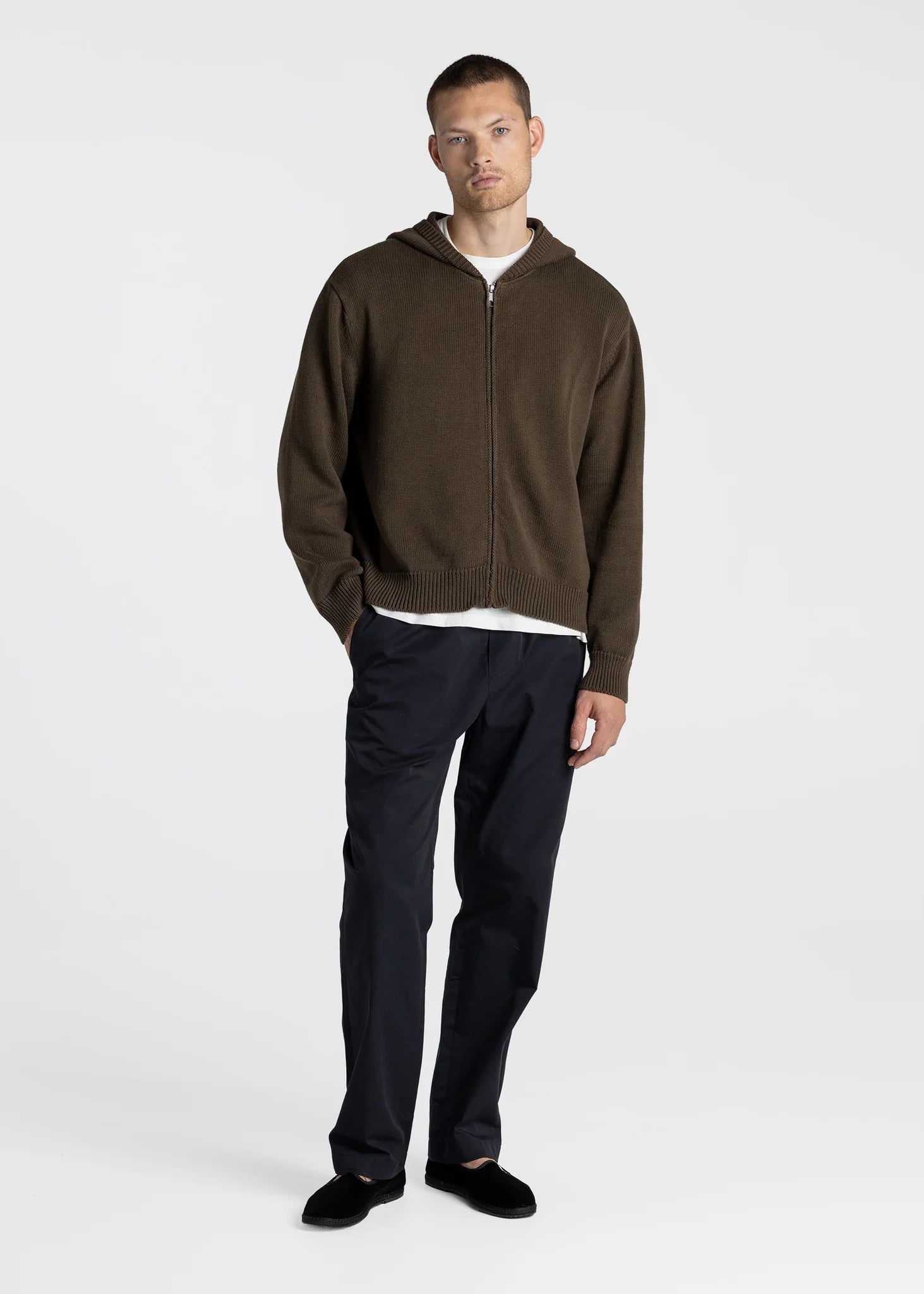 Our Knitted Zip Hoodie is designed for a boxy fit and knitted from Organic Cotton. The design features a ribbed collar hood, dropped shoulders and a silver YKK zipper.